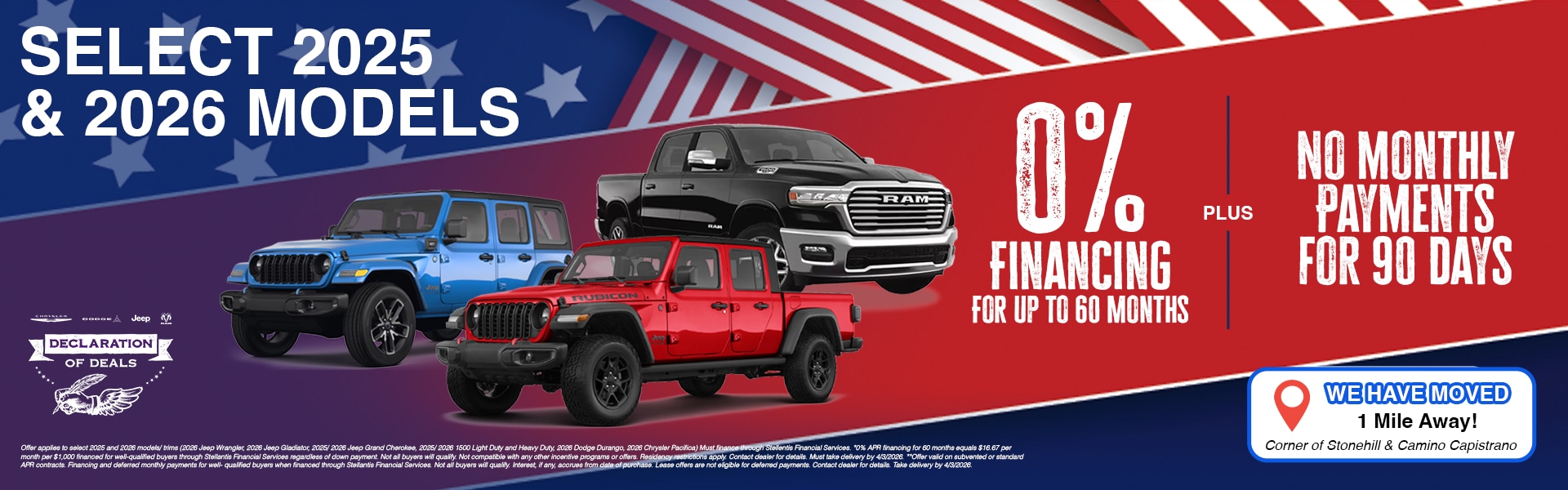 Speaking of new Dodge, Jeep, Chrysler, Ram models, you have your pick of our showroom. Our local dealership keeps a great stock of new and used trucks, and new Jeep SUVs for sale in inventory like the 2026 Jeep Gladiator, and the 2026 Ram 1500. Some of our most popular models include: