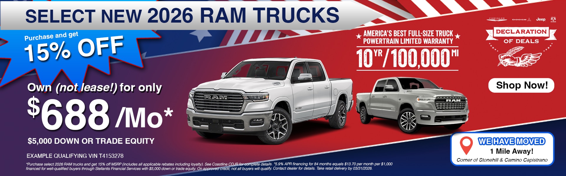 Coastline Chrysler Jeep Dodge Ram can help you find the right car, truck, or SUV for you. Whether you're a young professional looking to tackle the daily commute, a family driving the kids around town, or a business owner looking for a truck to support your business. Give us a call today for more information on getting your trade-in value. We hope you'll stop by today, and we look forward to serving you soon!