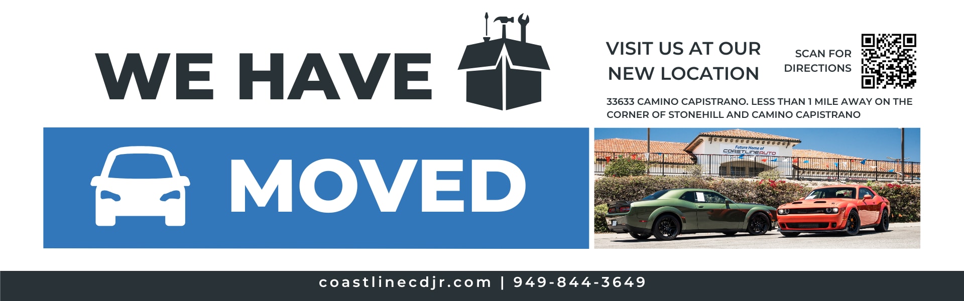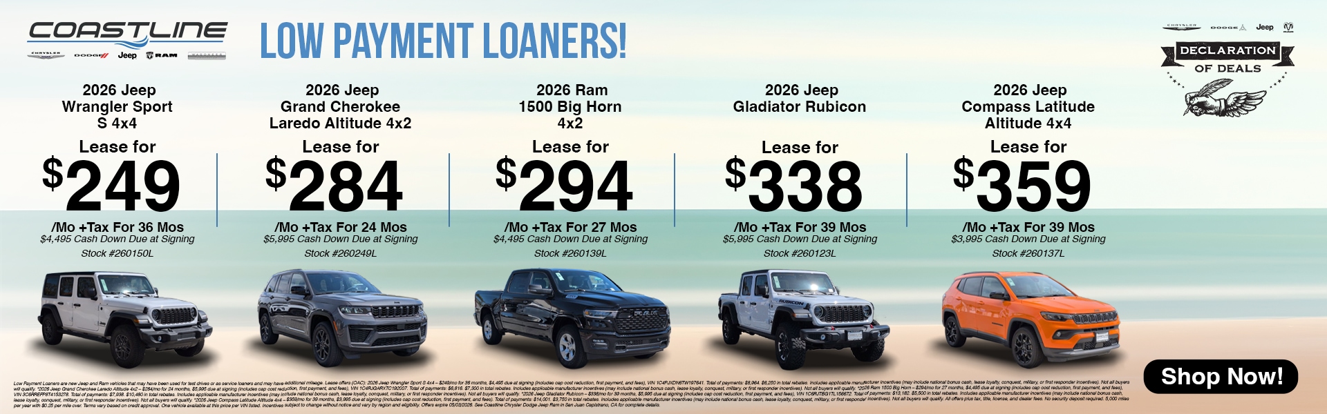 Here at Coastline Chrysler Dodge Jeep Ram, it is our mission to be the automotive home of drivers in the San Juan Capistrano, CA area. We are an Orange County dealership located near Ladera Ranch, Mission Viejo, Laguna Niguel, San Clemente, Aliso Viejo, Costa Mesa, Irvine, Huntington Beach and Laguna Beach, CA. We provide a vast selection of new and used vehicles, exceptional car care and customer service with a smile! We're a San Juan Capistrano's Chrysler, Ram, Dodge, and Jeep dealer.